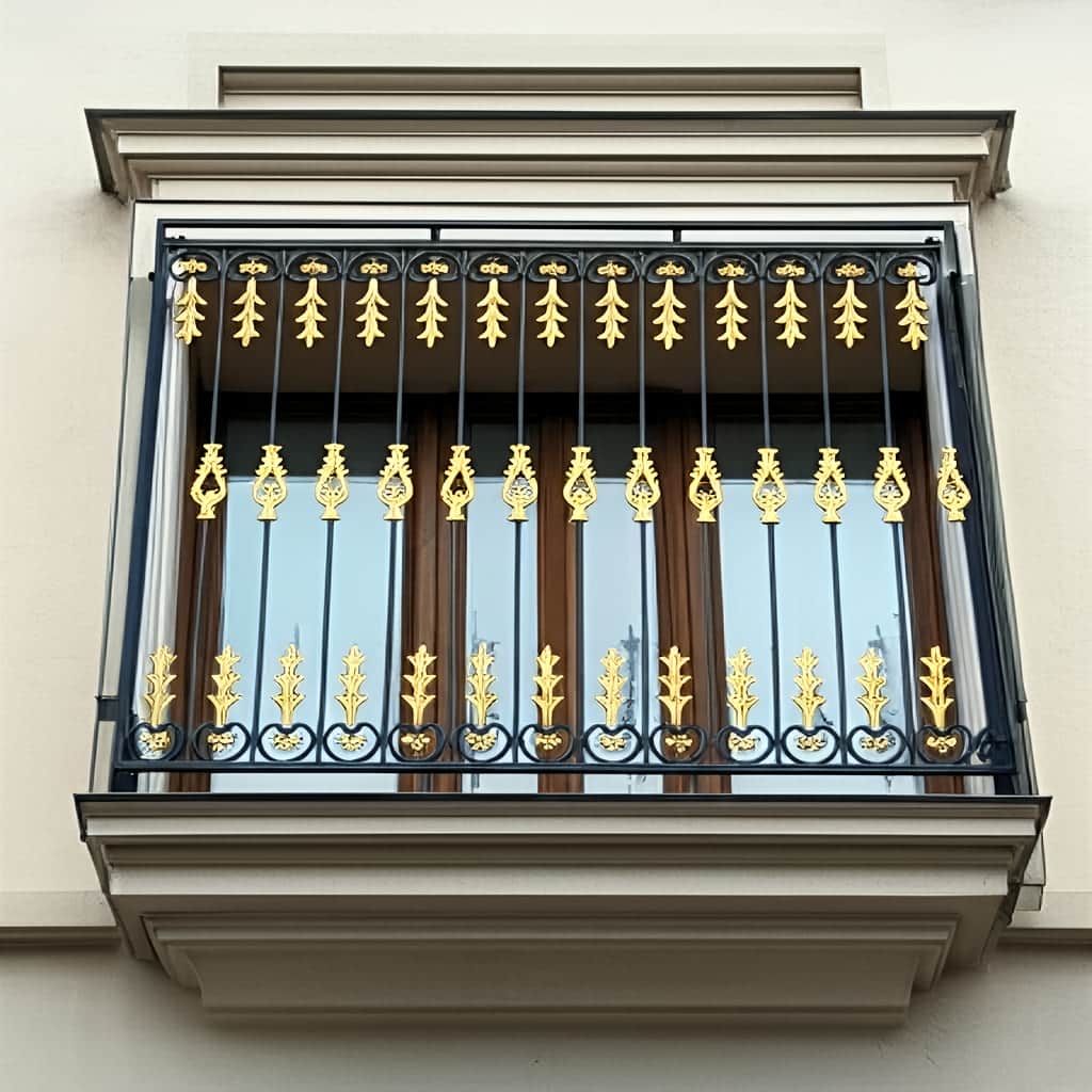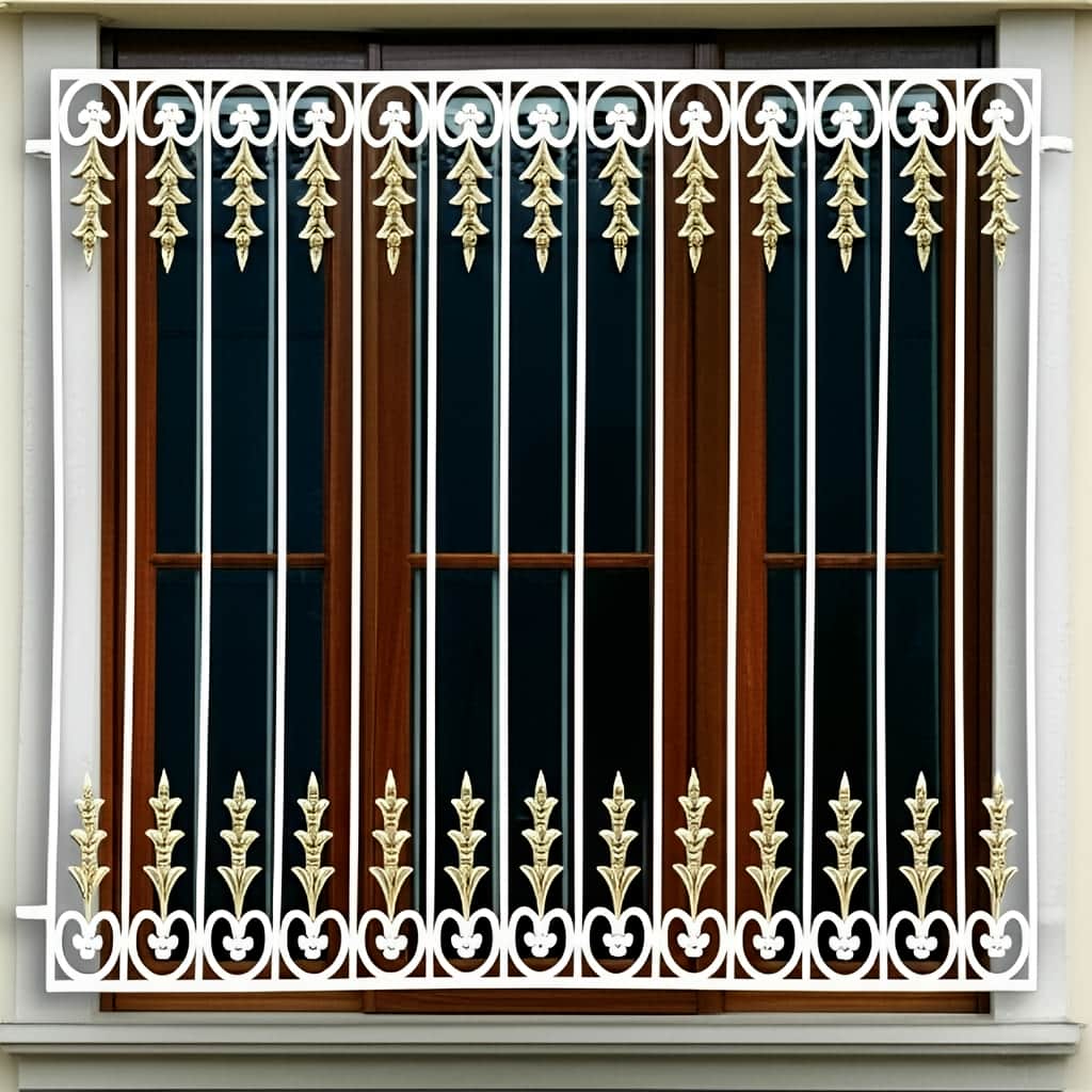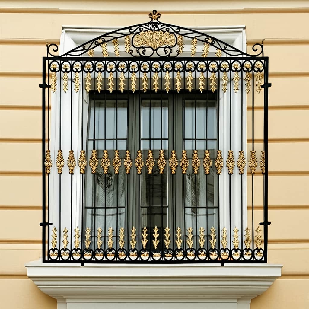 حفاظ پنجره مدل افشان از پروفیل فولادی کمکربن S355 با میلههای عمودی خمیده و تزئینات فرفورژه طلایی ساخته میشود. اتصال قطعات با جوش CO2 و پیچکاری دقیق، ساختاری بسیار مقاوم و بادوام را فراهم آورده است. پوشش چندمرحلهای پودری و آبکاری طلایی جزئیات، ماندگاری و زیبایی طولانیمدت را تضمین میکند.