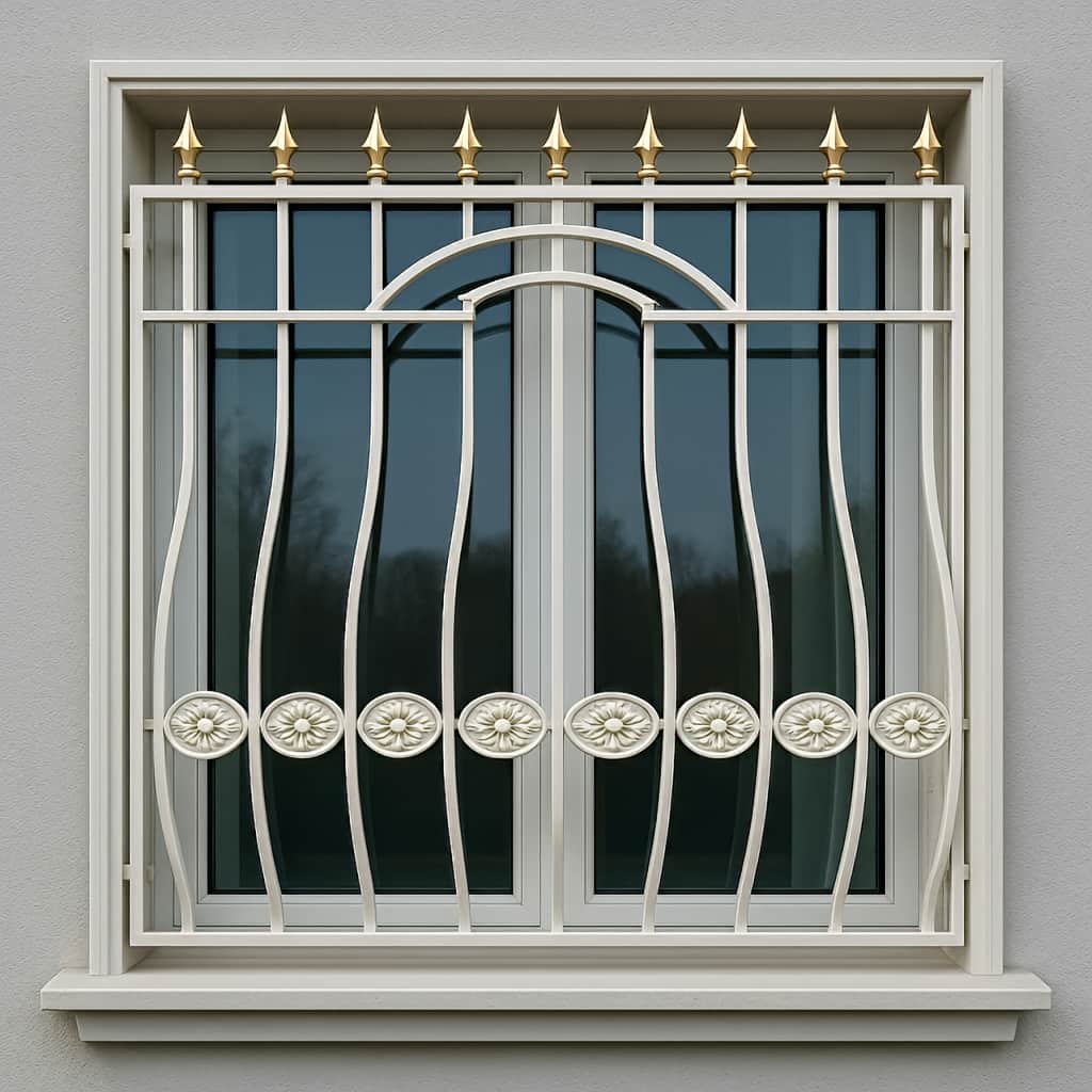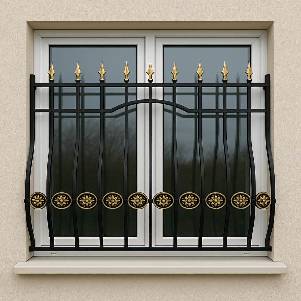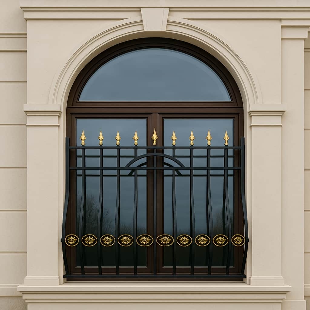این مدل با ترکیب خطوط منحنی و تزئینات گلبرگی آبکاری شده, نمایی اصیل و دکوراتیو به ساختمان می بخشد. قوس مرکزی و سرنیزه ها علاوه بر ایجاد تقارن, چشم اندازی جذاب و منحصر به فرد ایجاد می کنند که مناسب پروژه های خاص و نمای ایرانی است.