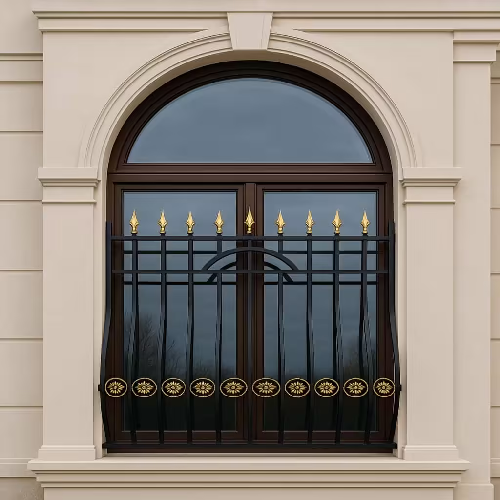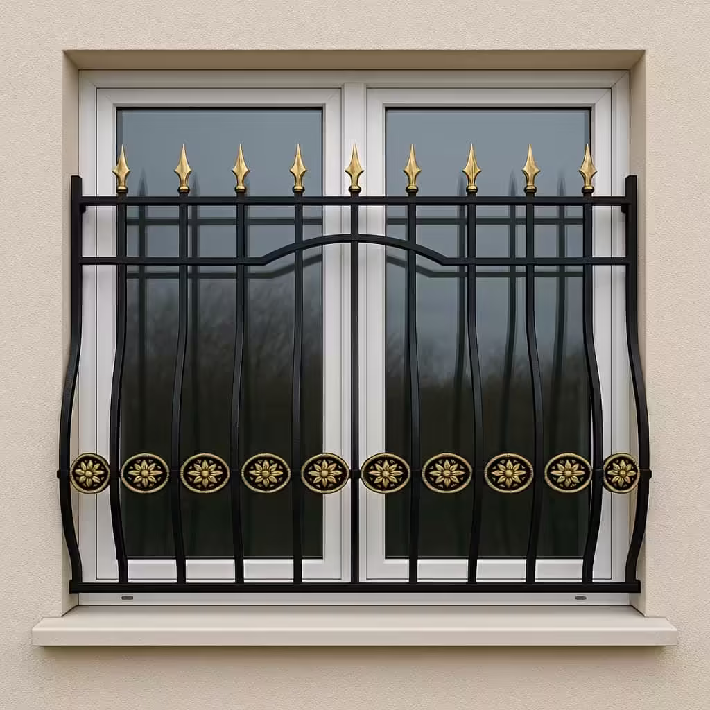 این مدل با ترکیب خطوط منحنی و تزئینات گلبرگی آبکاری شده، نمایی اصیل و دکوراتیو به ساختمان می بخشد. قوس مرکزی و سرنیزه ها علاوه بر ایجاد تقارن، چشم اندازی جذاب و منحصر به فرد ایجاد می کنند که مناسب پروژه های خاص و نمای ایرانی است.