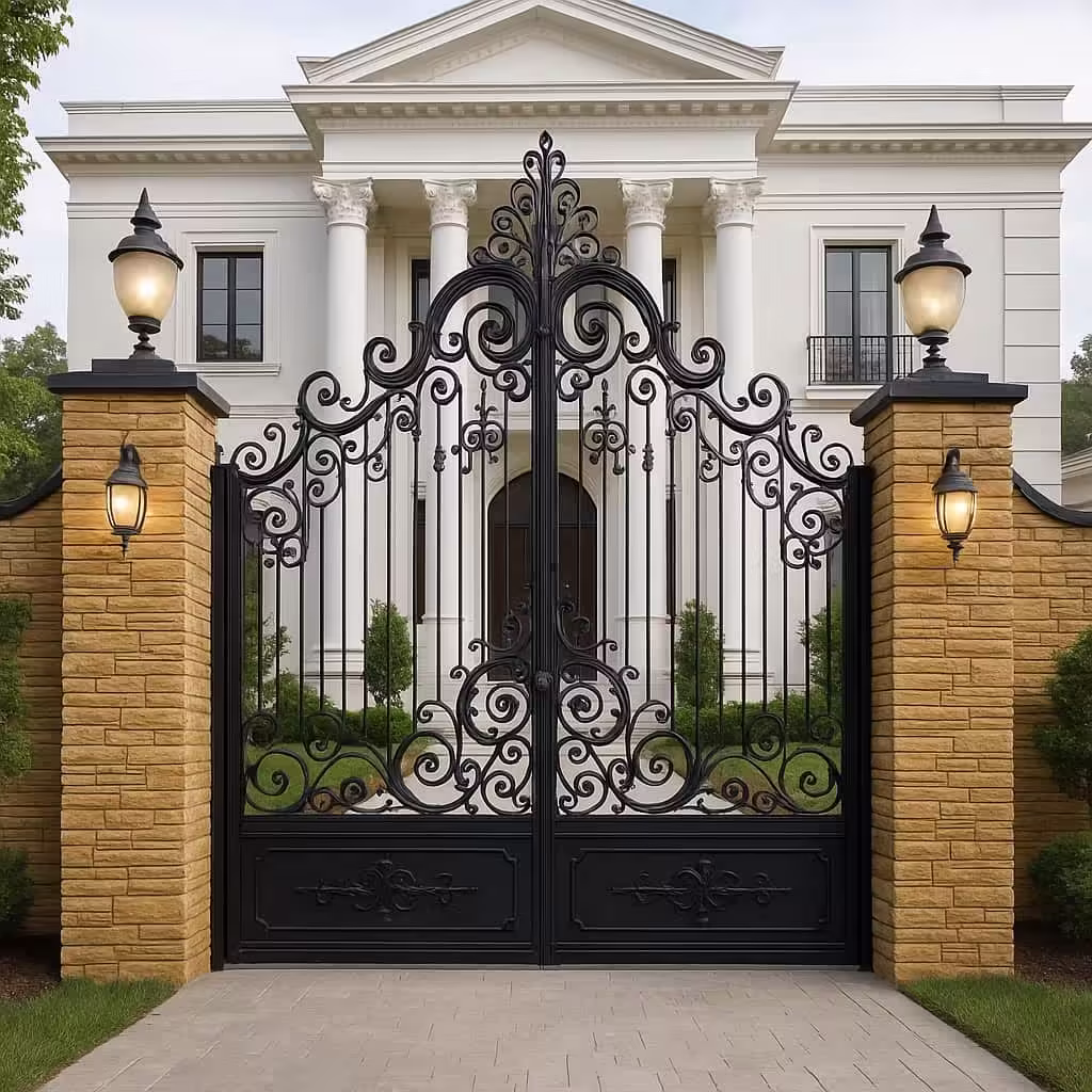 درب نگین از پروفیل های فولادی صنعتی با ابعاد و ضخامت بالا ساخته می شود تا استحکام و پایداری طولانی مدت حاصل گردد. اتصالات جوشکاری CO₂ صنعتی، تحمل بارهای سنگین و امنیت فوق العاده را تضمین می کند. تمامی اجزا پس از مونتاژ کامل، با رنگ پودری کوره ای پوشش داده می شوند تا در برابر عوامل محیطی مقاوم بمانند. جزئیات فرفورژه به صورت دستی و با دقت هنری بالا روی فلز اجرا می شود که هویت منحصربه فرد مدل نگین را شکل می دهد.