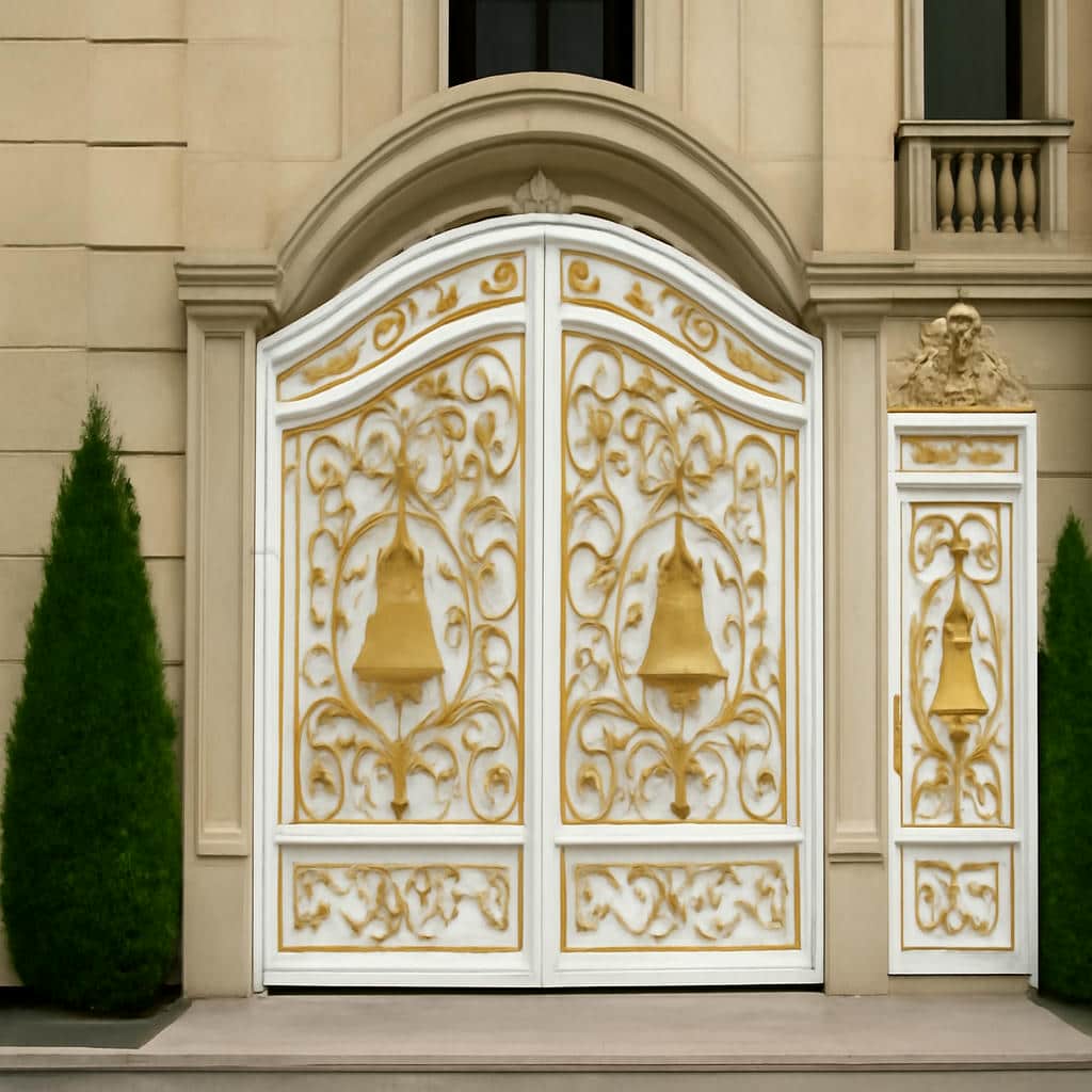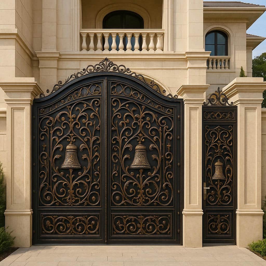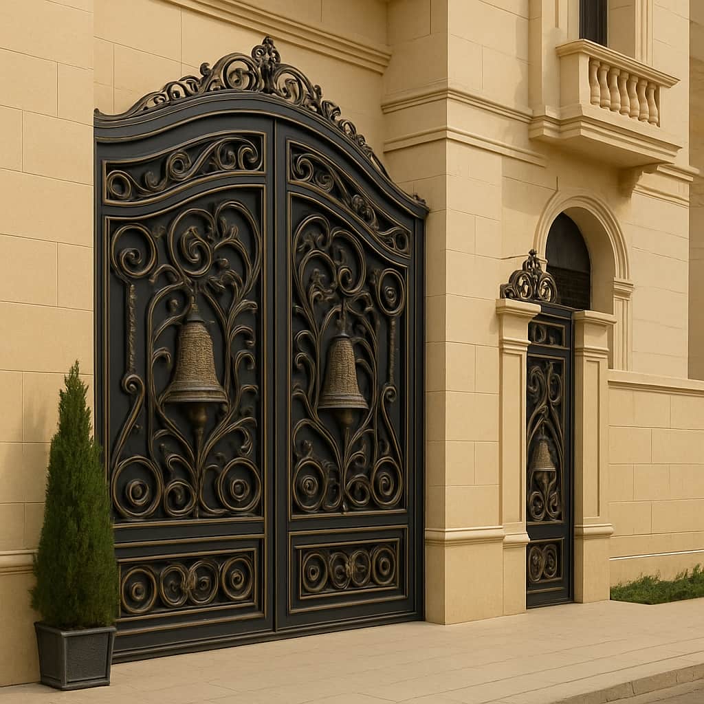 درب فلزی مدل زنگوله با شاسی فولادی سنگین, چهارچوب صنعتی و قطعات فرفورژه فرم دهی شده ساخته می شود. اتصالات جوشکاری CO₂, پوشش رنگ الکترواستاتیک و زیرسازی ضدزنگ, این محصول را برای سال ها در برابر زنگ زدگی و آسیب های محیطی مقاوم نگه می دارد. هر بخش از درب, از فرم زنگوله مرکزی تا جزئیات ریز فرفورژه, قابلیت سفارش و تغییر دارد.