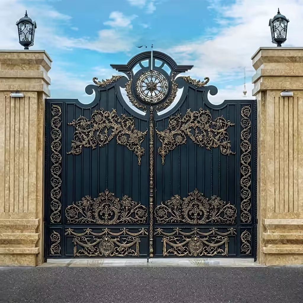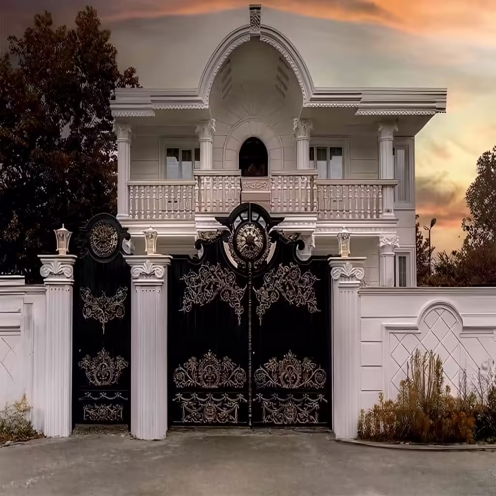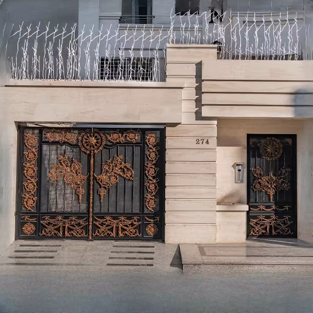 درب لادن از پروفیل چهارچوبی فولادی، قطعات فرفورژه فرم دار و میلگردهای خم کاری شده ساخته می شود. جوشکاری صنعتی CO₂ با کیفیت بی نظیر و پوشش رنگ پودری کوره ای، مقاومت عالی در برابر زنگ زدگی، سایش و نور خورشید فراهم می آورد. تزئینات تاج و گل نرده، ظرافت و جلوه ای لوکس به نما می دهد.